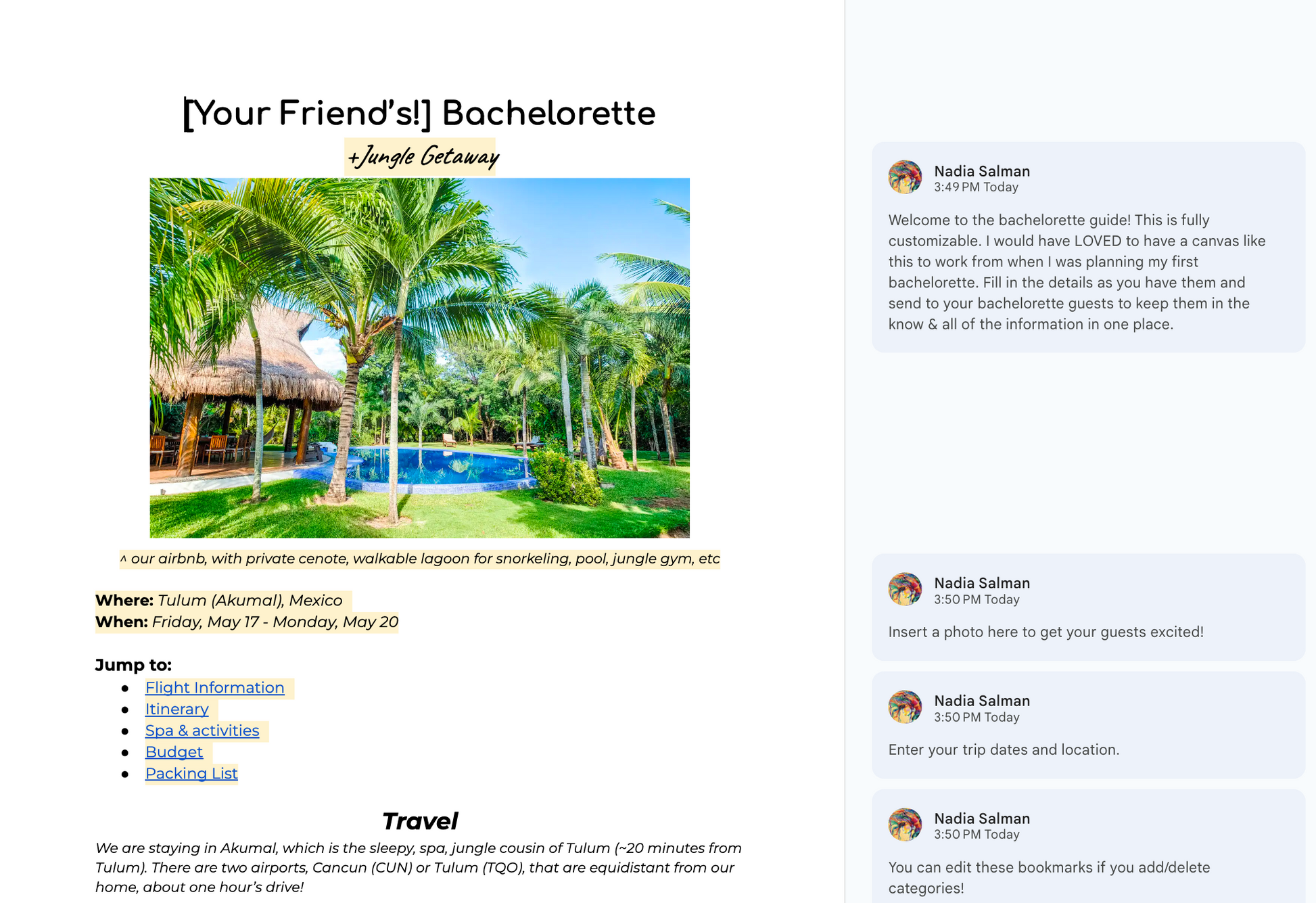 - Bachelorette Powerpoint with a customizable template to pitch your bride (and/or bridesmaids) on potential trip options.